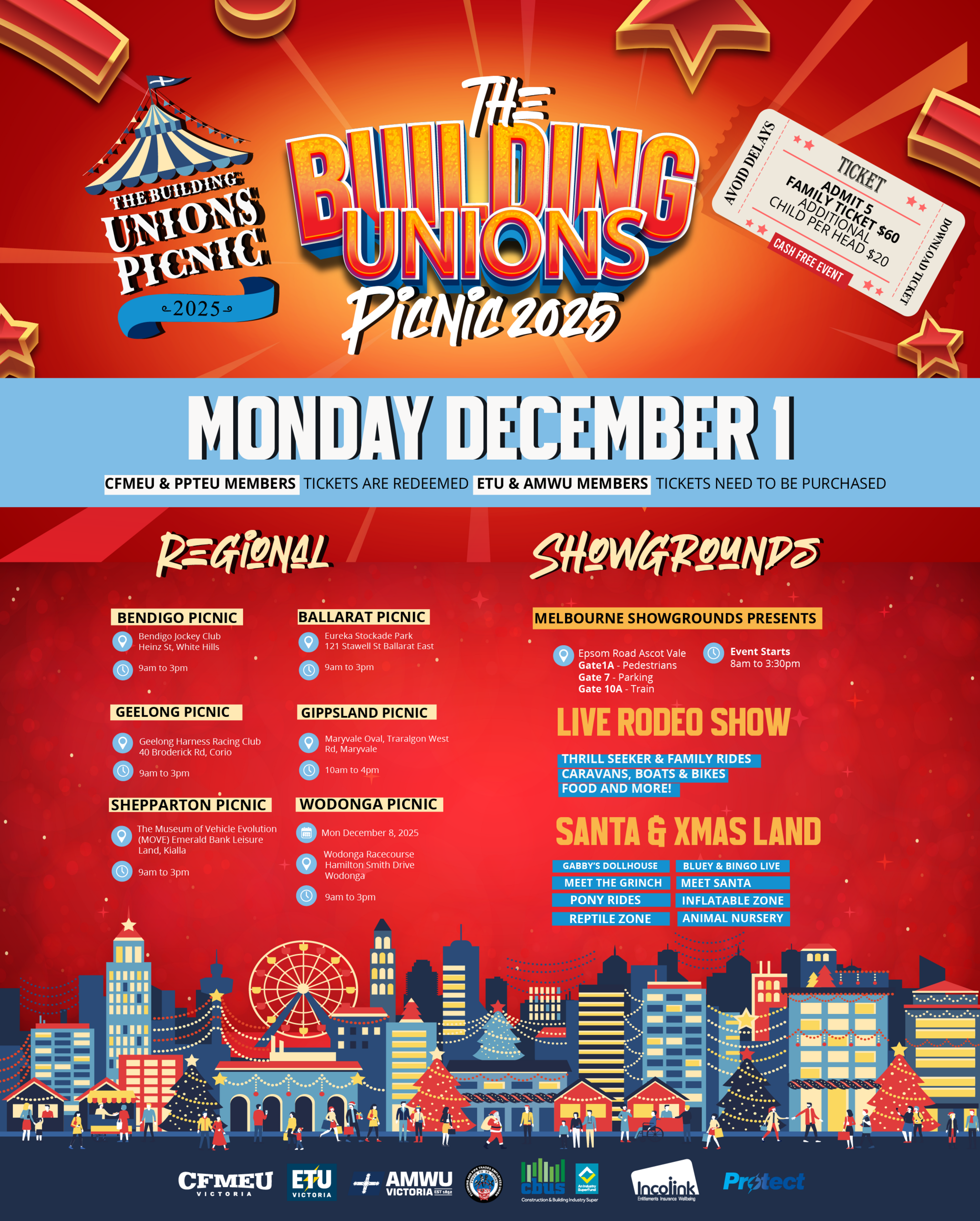The 2025 Builders Union Picnic is back at The Royal Melbourne Showgrounds!